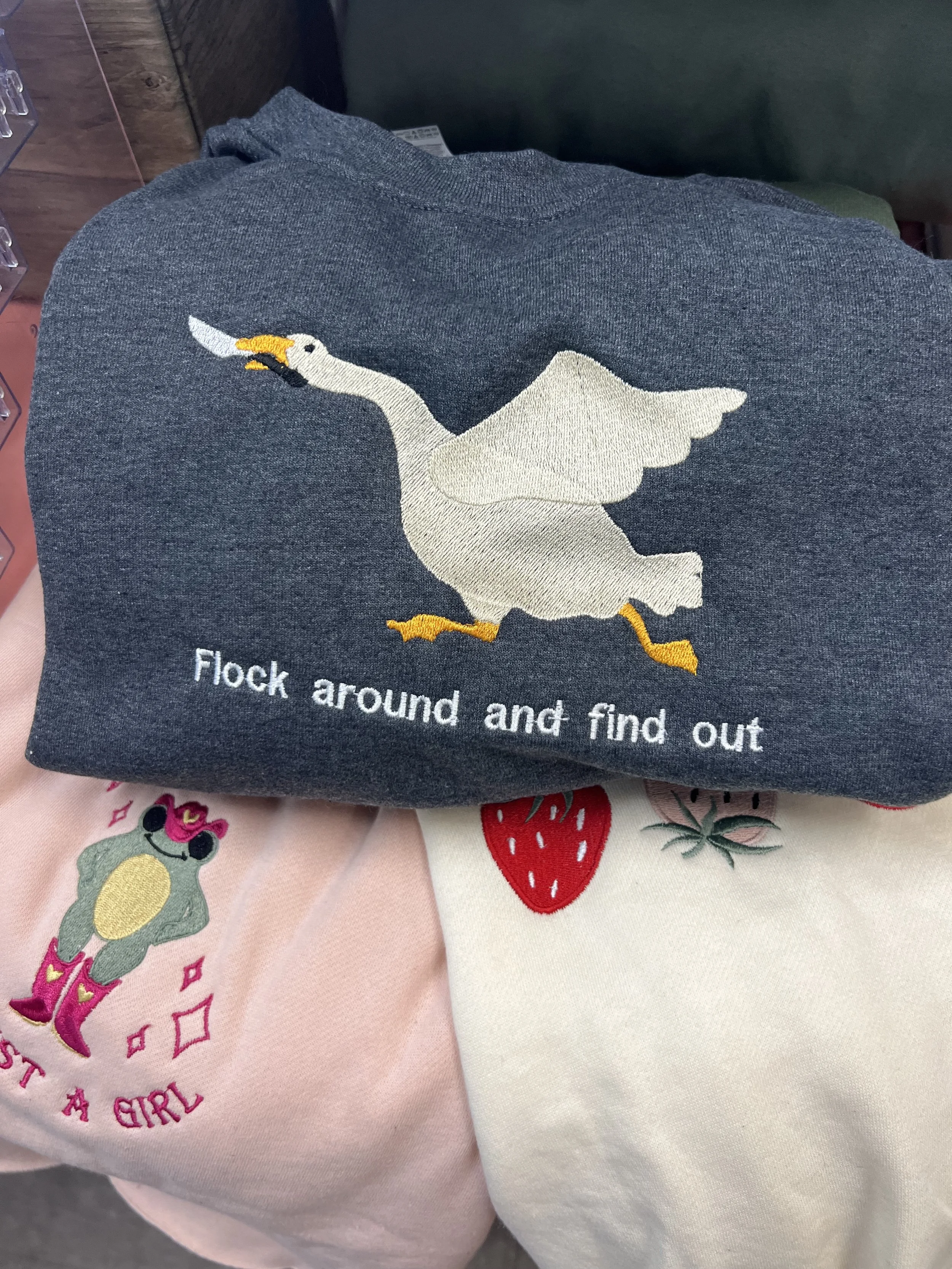 Stickers, Prints, Keychains, Pins, Standees and Embroidered Sweatshirts